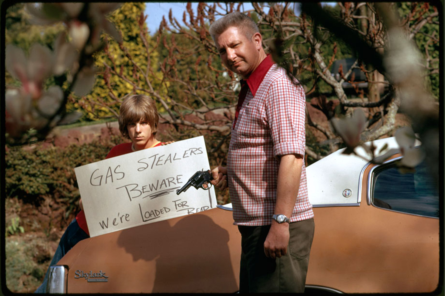 1973年,OPEC阿拉伯產油國對支持以色列的西方國家實施石油禁運並大幅抬價,引發第一次石油危機(1973-1974)。看似遙遠的國際角力,卻快速影響到美國普通家庭:油價飛漲、政府實施汽油配給,出門加油還得看車牌號碼,社會一度陷入恐慌與混亂。圖中父子舉牌警告竊油者,正是當時緊張氛圍的縮影。