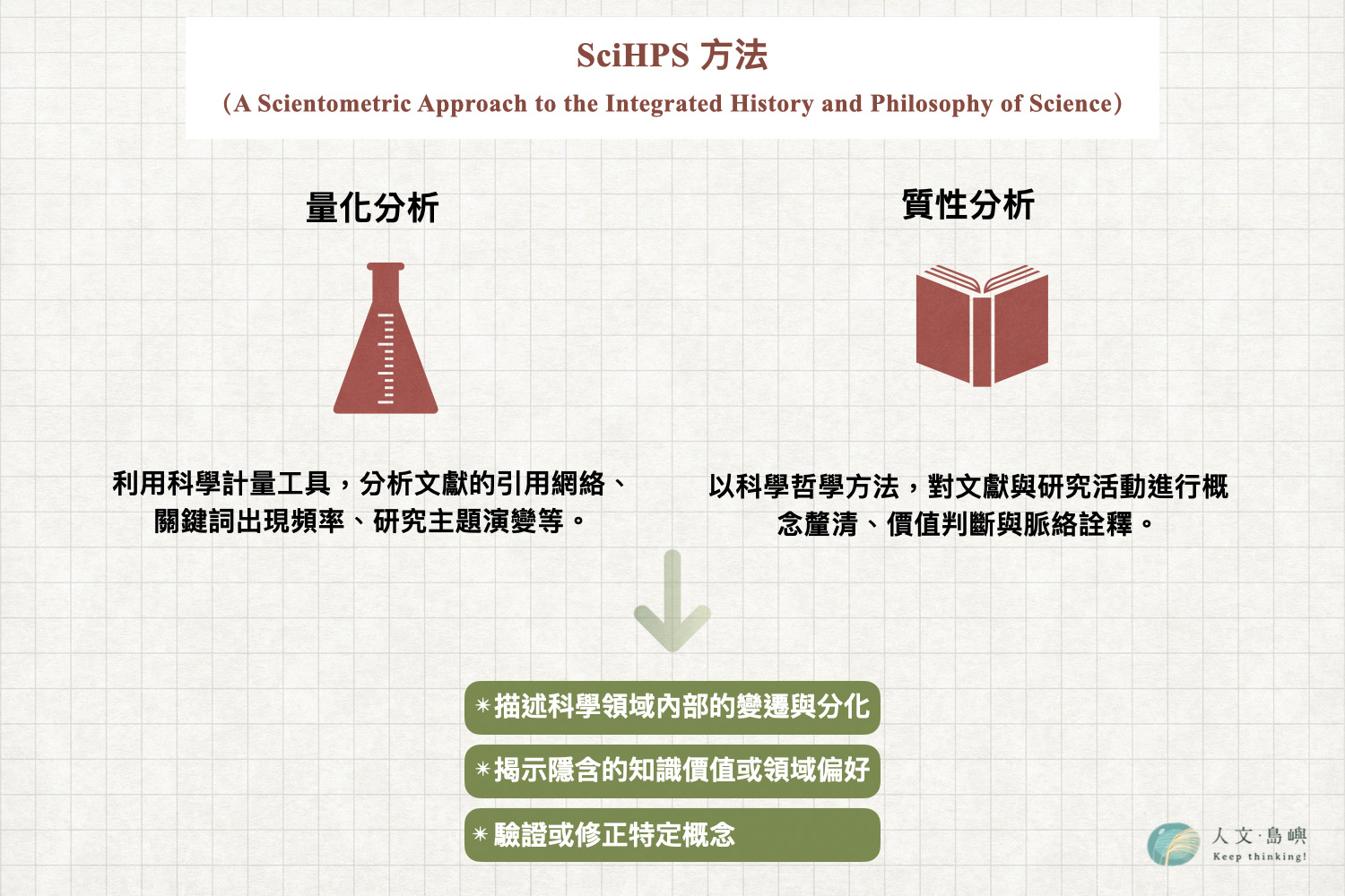 SciHPS 是一種結合量化工具與哲學詮釋的跨學科研究方法,用來找尋科學共識的形成節點與標準知識的來源。